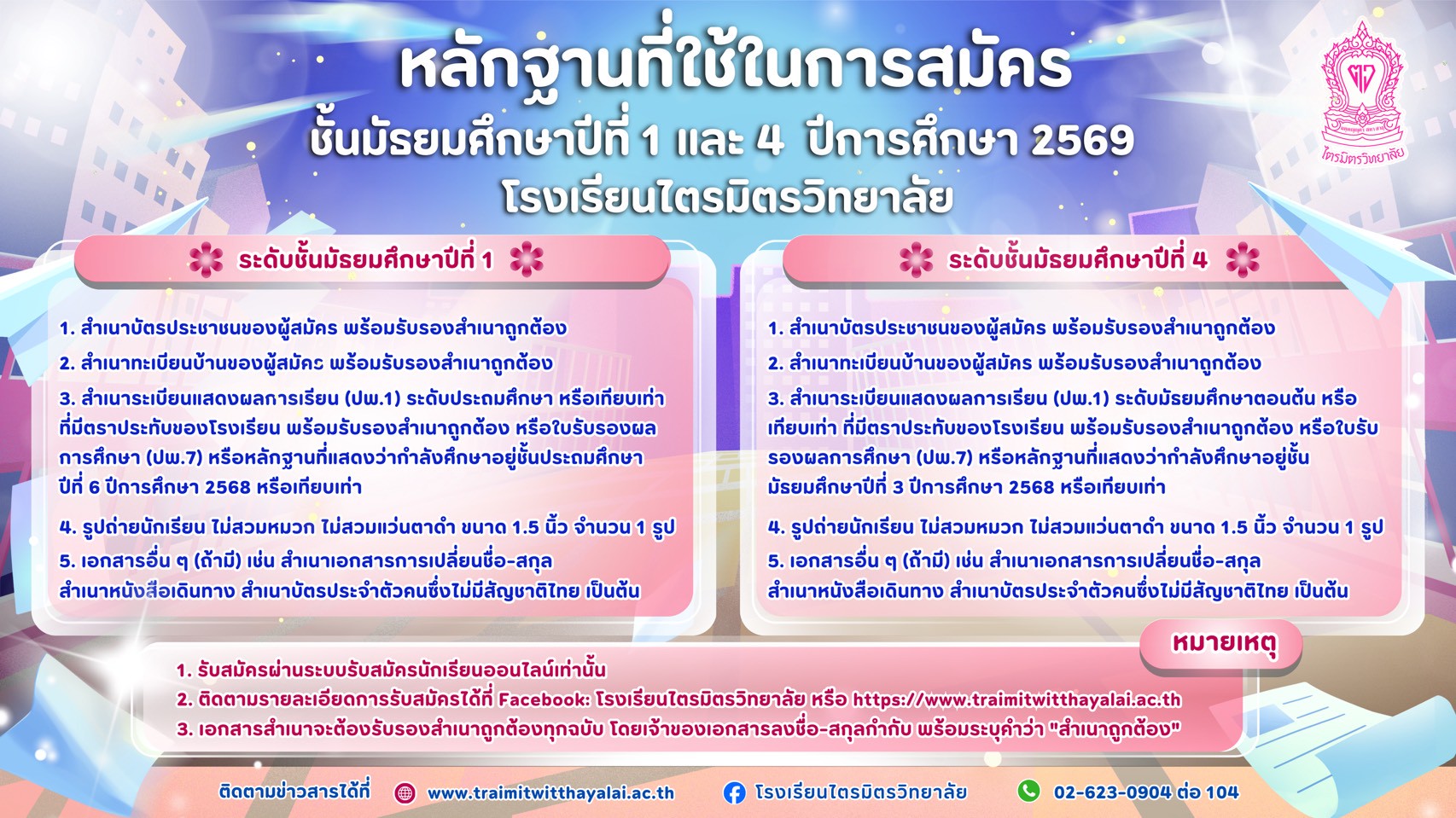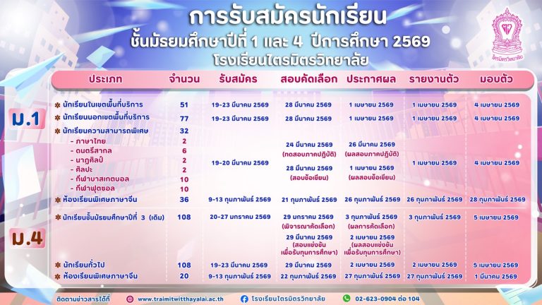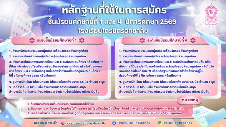 ประกาศโรงเรียนไตรมิตรวิทยาลัย เรื่อง การรับสมัครนักเรียนเข้าเรียนในสถานศึกษา ชั้นมัธยมศึกษาปีที่ 1 และ 4 ปีการศึกษา 2569
